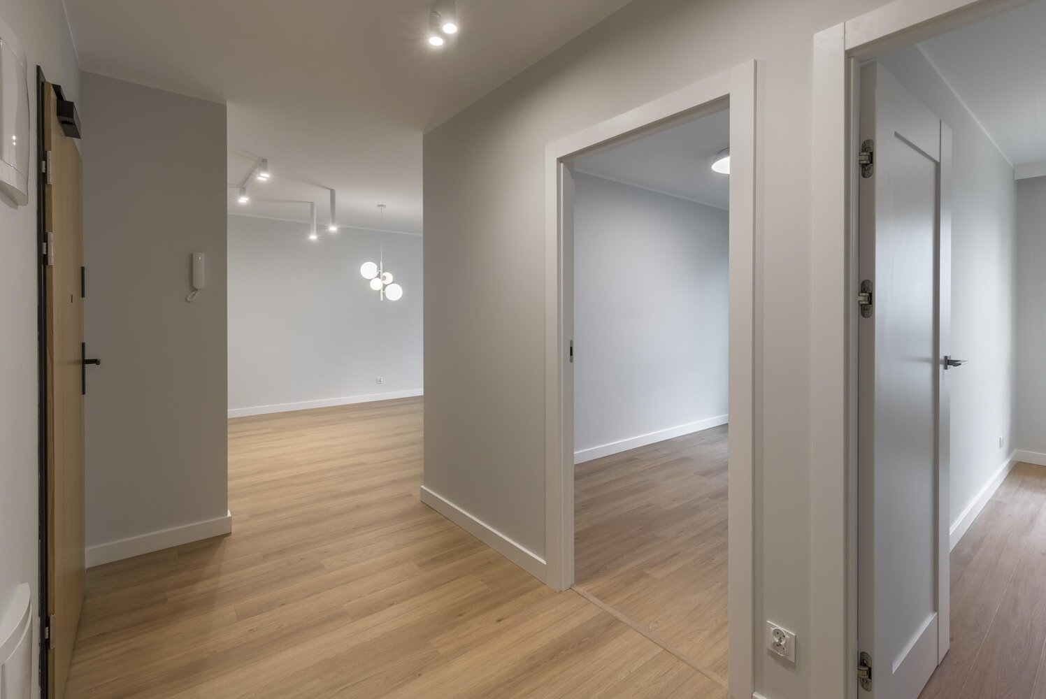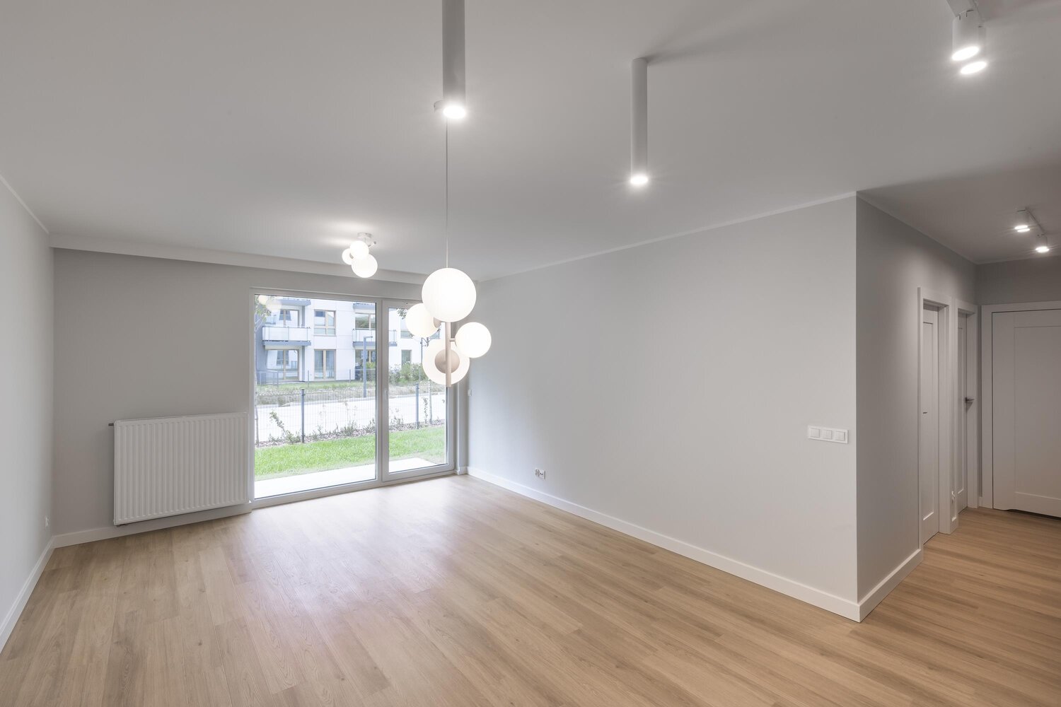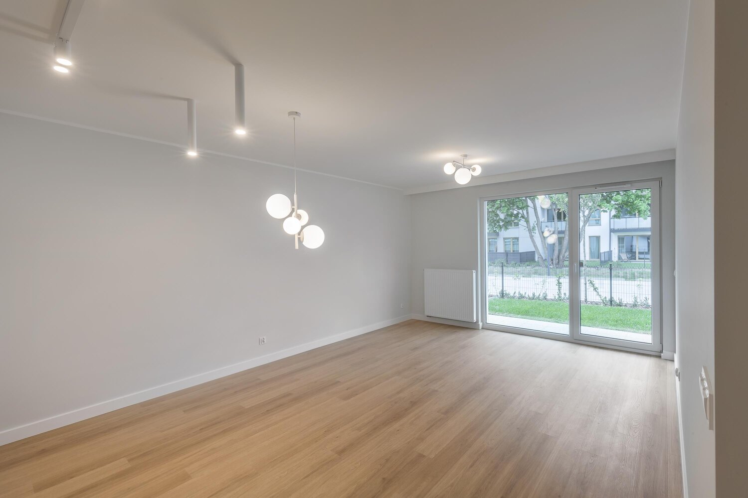 z listwami przypodłogowymi oraz gustowne lampy we wszystkich