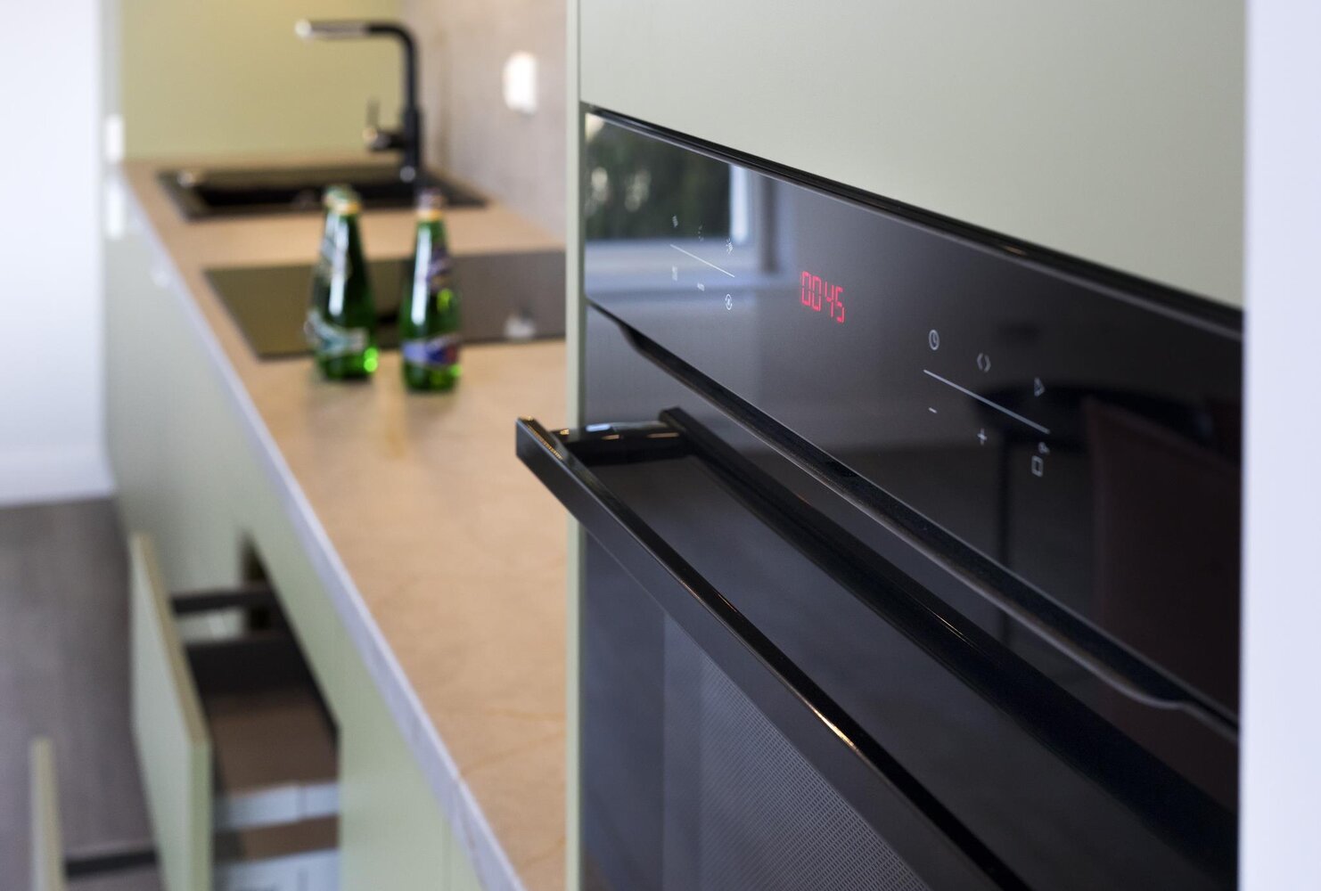 sypialnie oraz salon z dużą, ustawną zabudową kuchenną. Tu
