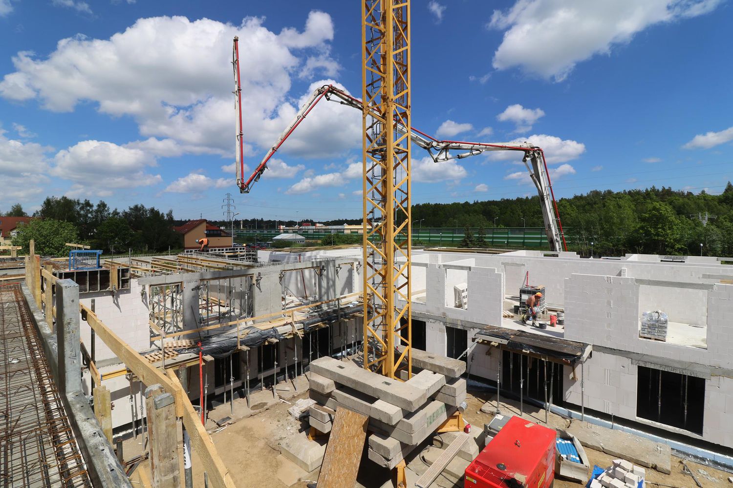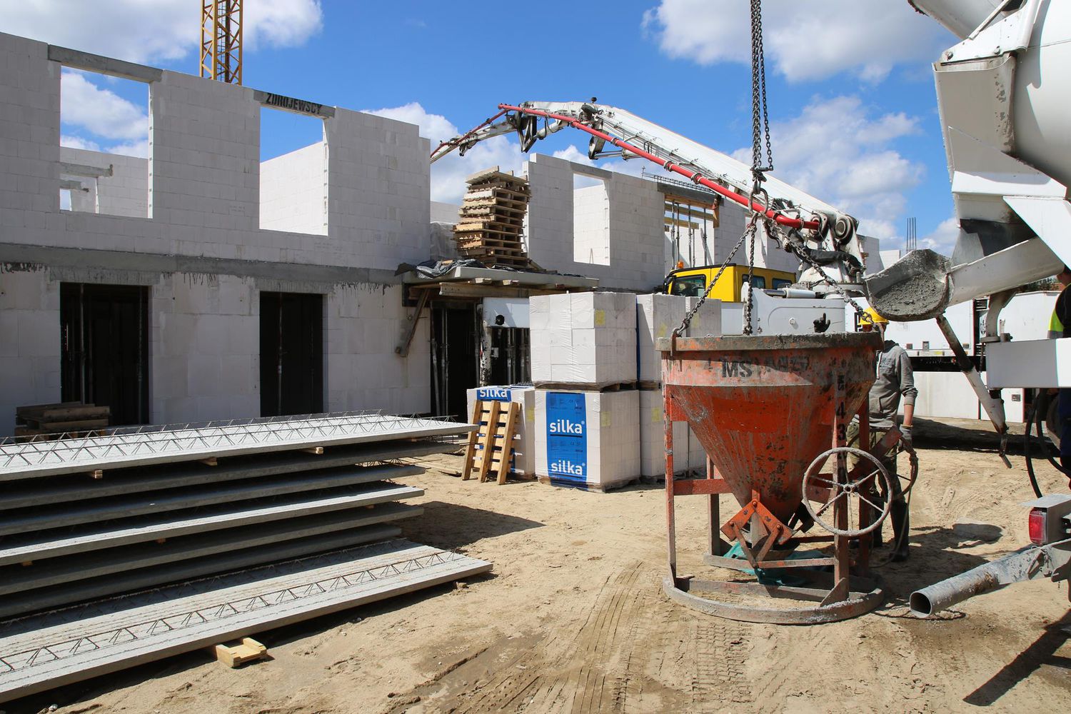 Wielka pompa wylewa setki ton betonu na przygotowaną i wzmocnioną