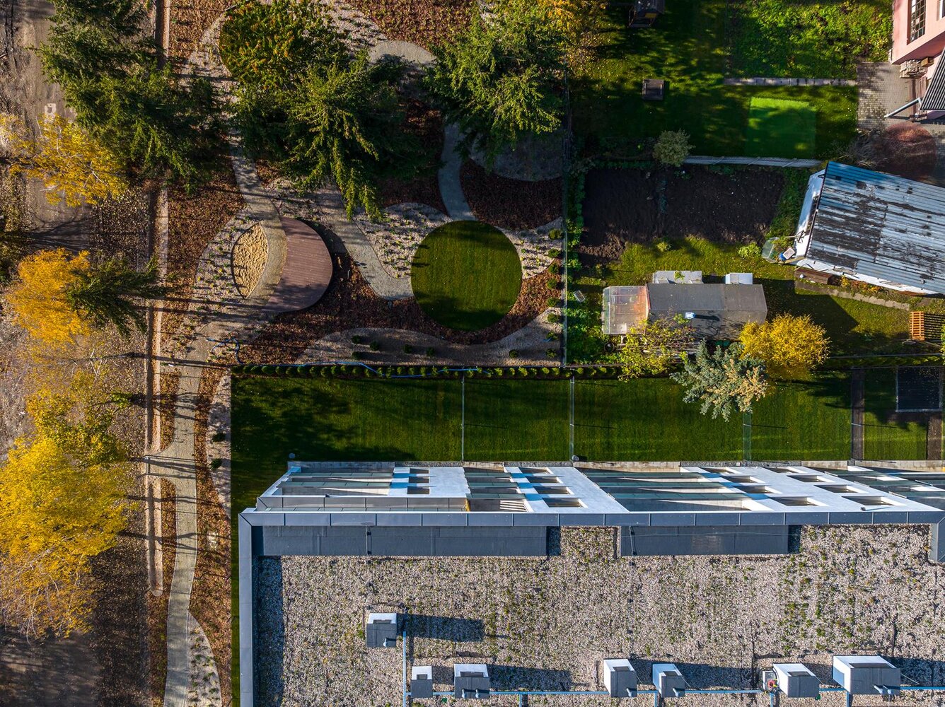 ścieżkami spacerowymi, ogród ze sprzętem do ćwiczeń na